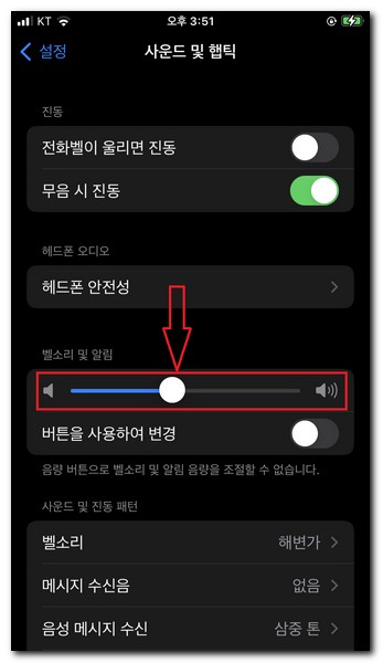 음량 버튼으로 벨소리 및 알림 음량을 조절할 수 없기 때문에 아무리 아이폰에 있는 실물로 된 음량버튼을 최대로 크게 해도 소리가 안나는 이유가 있었던 것이다.