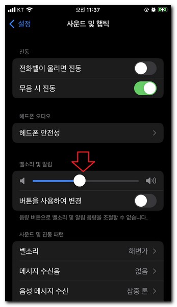 벨소리 및 알림 슬라이더를 좌우로 몇 번 이동해본다.