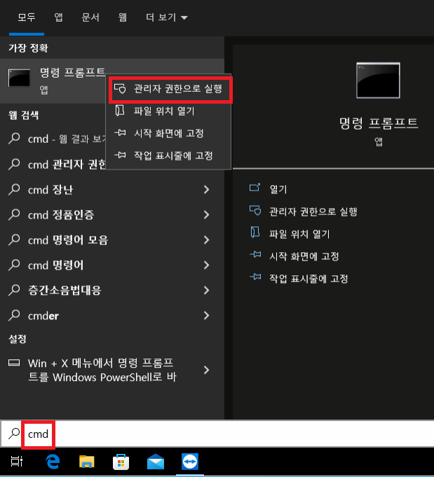 윈도우키 + cmd 명령어 + 명령프롬프트 관리자 권한으로 실행