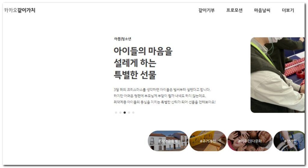 카카오에서는 같이가치라는 프로젝트를 통해서 기부를 진행할 수 있다.