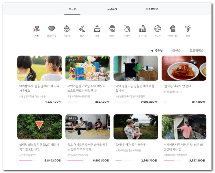 코로나19, 어린이, 청년, 여성, 어르신, 장애인, 우리사회, 지구촌, 어려운이웃, 환경까지 다양한 주제들이 있는데 본인이 살고 있는 집 근처 어려운 이웃을 도와줄 수도 있지만 멀리 있는 이웃들도 도울 수 있게 되어 있다.