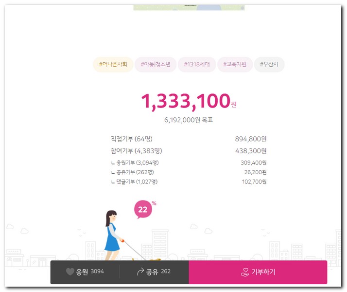 기부하기 버튼과 응원하기 버튼, 공유 버튼을 통해서 여러사람들에게 어려운 이웃을 알리는것도 꼭 잊지 않았으면 좋겠다.