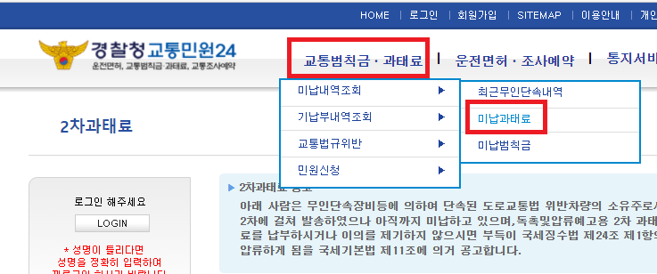 교통범칙금 및 과태료 조회 -> 미납내역조회 -> 미납과태료를 선택