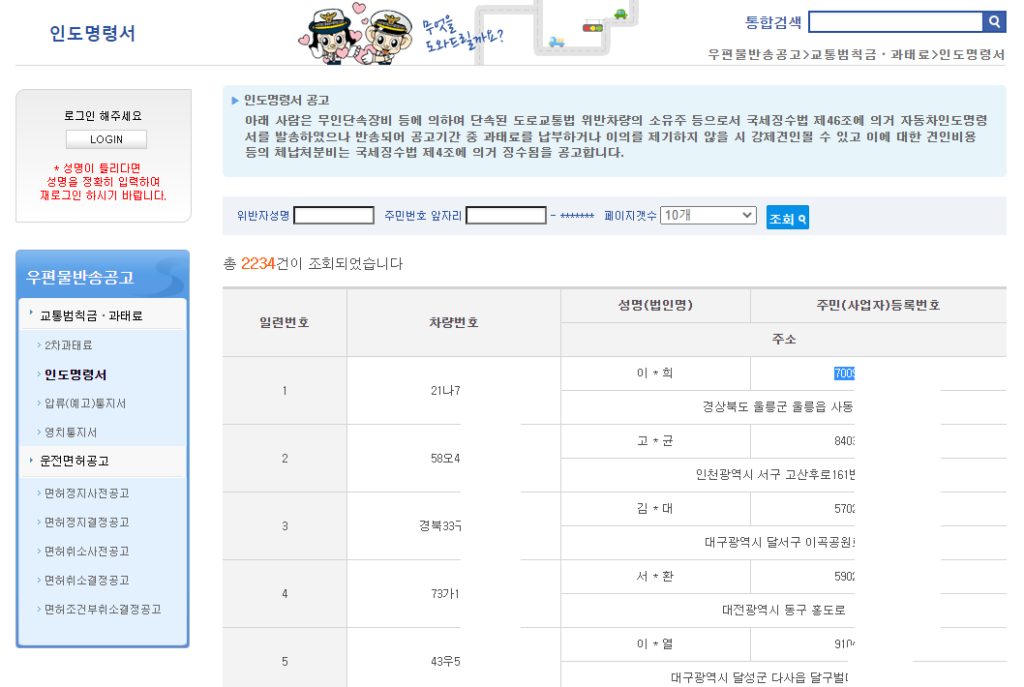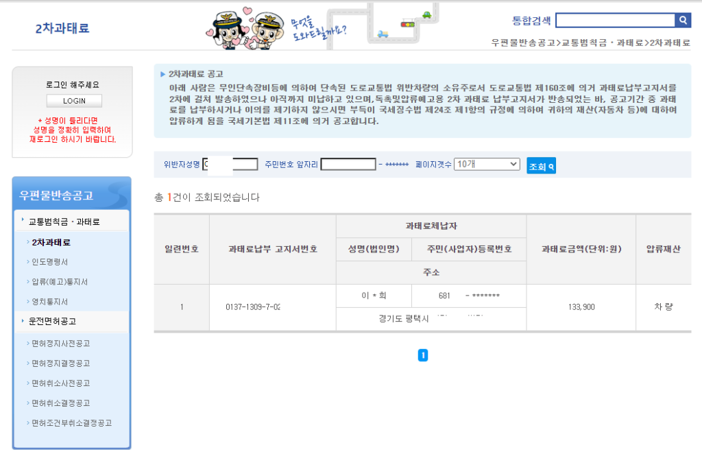 1차 과태료 공고는 못하기 때문에 과태료 고지서를 받고 바로 세금을 납부한 운전자의 경우에는 조회를 할 수 없으며 2차 과태료 공고와 인도명령서를 받지 않은 운전자에 대해서만 조회가 가능하다.