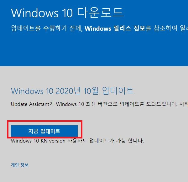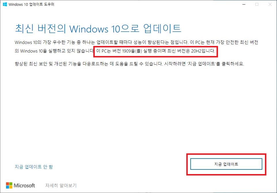 윈도우10 업데이트 도우미를 이용해서 지금 업데이트를 진행하면 된다. 현재 필자의 윈도우10 버전은 1909인데, 최신버전은 20H2버전이 업데이트 된 상태다.