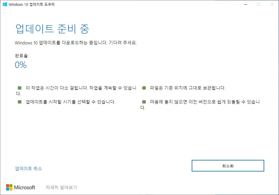 업데이트 파일을 다운로드 받고 완료까지는 대략 1시간정도가 소요된다. 물론 PC성능에 따라서 업데이트 버전별 차이에 따라서 시간은 줄어들수도 있고 늘어날수도 있다.