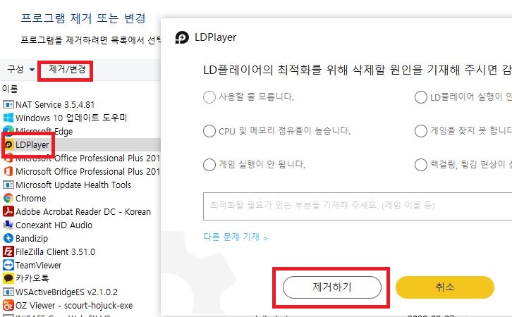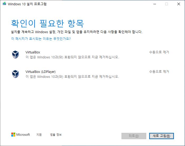 확인이 필요한 항목이라는 메시지와 함께 LDplayer를 삭제해야만 업데이트를 계속 진행할 수 있게 된다. 만약 중요한 프로그램을 삭제하는것이라면 업데이트를 중단하는것이 좋다.