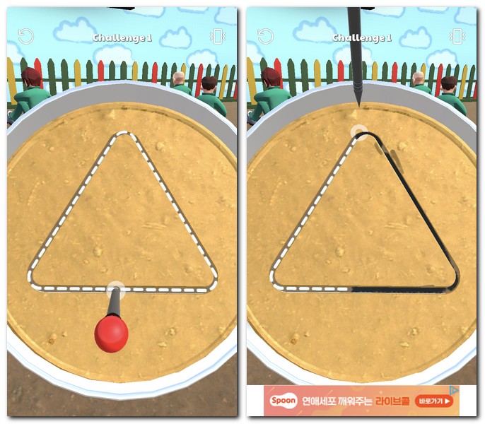 9) 마지막게임으로는 딱지치기 게임이다. 오징어게임 딱지치기 게임과 비슷한데, 어느부위로 쳐야 정확하게 넘길 수 있을지 결정된다. 터치를 잘하면 된다.