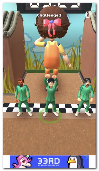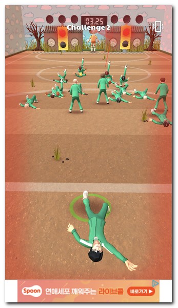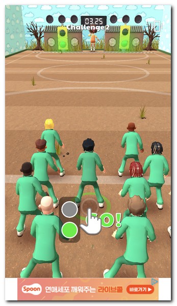 2) 무궁화꽃이 피었습니다. 게임을 시작하는데, 맨 앞에는 여자인형이 서 있게 된다. 시간이 흐르고, 타이밍에 맞춰서 이동하면 된다. 길게 터치하면 이동하고, 터치를 중단하면 멈춘다.