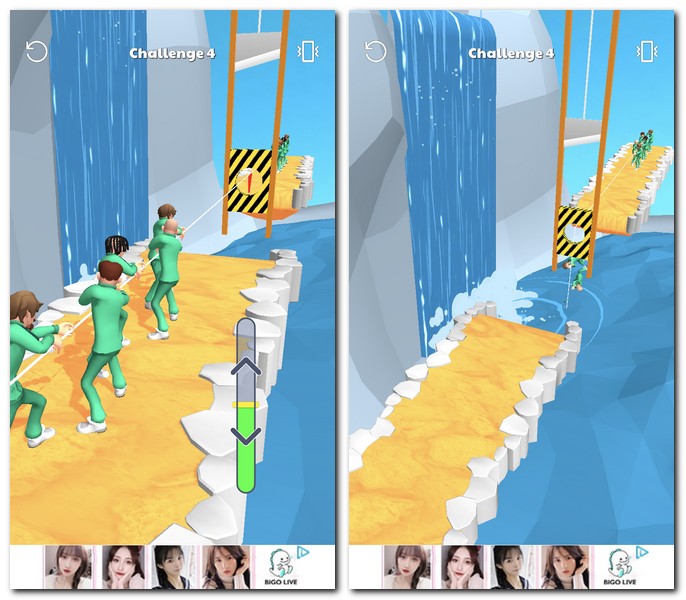 5) 그 다음게임은 줄다리기 게임이다. 실제 영화에서와 비슷한 모습을 보여준다. 중간에 폭포가 있는 부분에서 떨어지는 모습을 보여준다. 힘조절은 적절하게 조절해서 땡기면 된다.