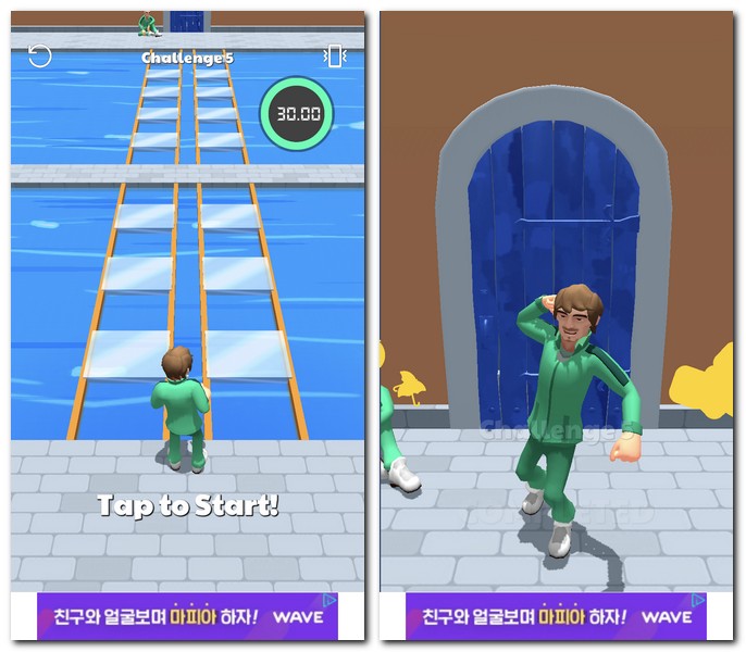 6) 영화에서는 마지막게임이었던 징검다리 건너기인데, 투명 유리를 잘 확인해야된다. 게임에서는 미리 0.5초정도 이동가능한 구간을 알려준다. 잘 기억했다가 이동하면 된다.