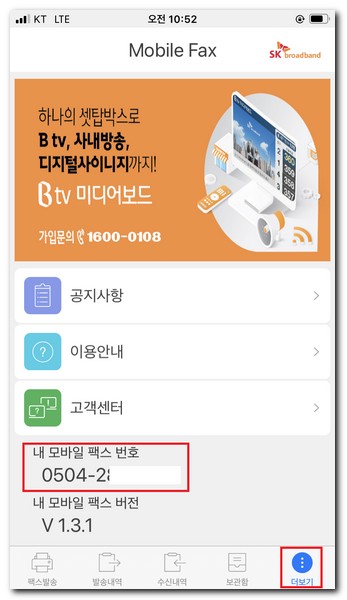 휴대폰으로 팩스 받는 방법은 더 간단하다. Mobile Fax 어플을 실행해서 더보기 탭을 터치한다.