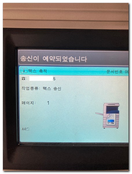 필자가 테스트를 위해 사무실에 있는 복합기를 이용해서 팩스를 보내봤다. 실제로 팩스를 보내는 사람이 이와 같이 송신이 예약되었다는 메시지와 함께 송신이 정상적으로 되었다고 표시된다.