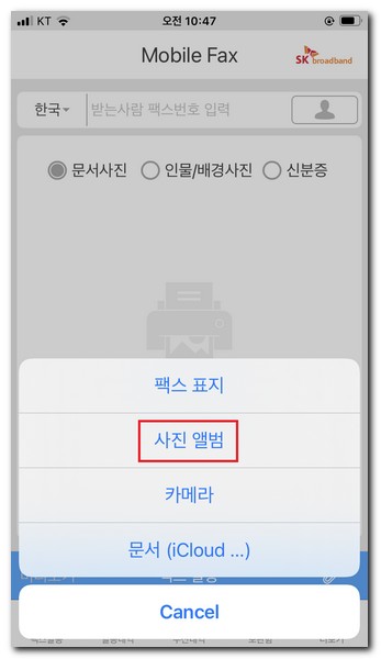 문서, 사진 등을 선택 후 사진 앨범 버튼을 터치한다.
