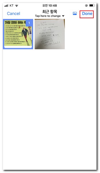 보내고 싶은 사진이나 문서 등을 선택 한 후에 Done 터치