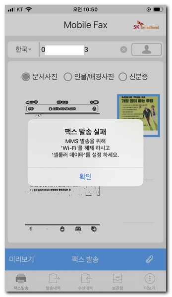 팩스 발송 버튼을 터치하게 되면 와이파이 연결상태에서는 팩스 발송이 안된다. 셀룰러 데이터로 변경하거나 와이파이 연결을 해제하도록 한다.