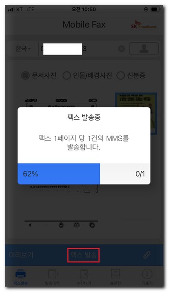 와이파이 연결을 해제한 후에 팩스 발송 버튼을 터치하게 되면 팩스 발송이 진행된다.