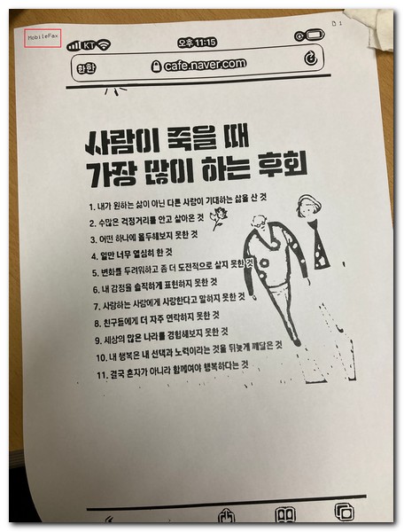 실제로 필자가 받은 A4용지의 팩스 문서이다. 모바일 스마트폰으로 보낸 사진이 흑백사진으로 문서화 되어 전송 받았다. 좌측 상단에 모바일 팩스라고 영어로 적혀 있는게 보인다.