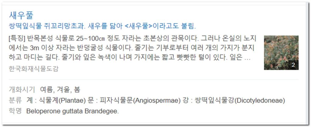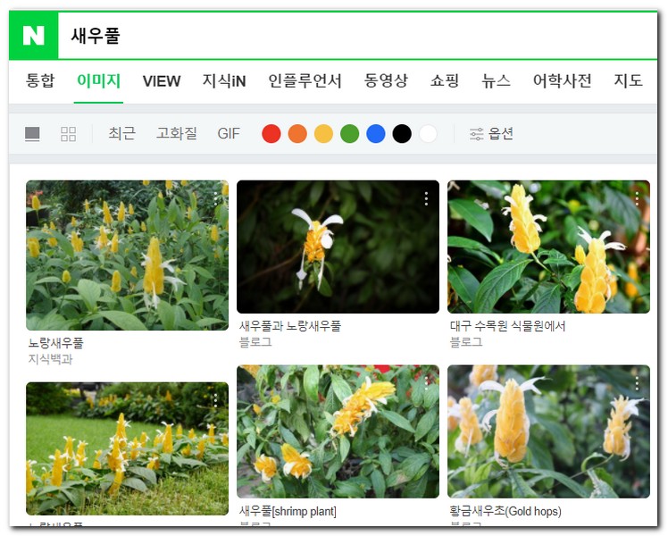 새우풀 이라고 검색하게 되면 이미지가 보이게 된다. 지식백과 및 블로그, 카페, 온라인 쇼핑몰 등 인터넷에 올려놓은 사진을 검색해서 찾을 수 있다.