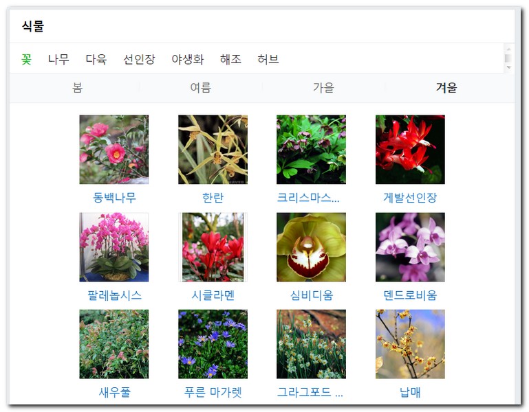 겨울에 피는 꽃의 사진을 찾는 방법은 네이버, 다음, 구글에서 해당 꽃의 이름을 이미지로 검색하면 된다.