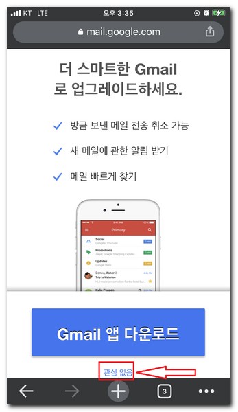 Gmail 앱 다운로드를 선택하지 말고, "관심 없음"을 선택한다.