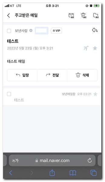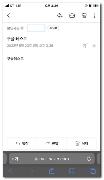 구글에서 네이버로 이메일을 발송하였더니 정상적으로 메일 발송이 된 것을 확인할 수 있었다.