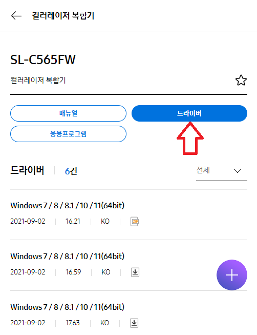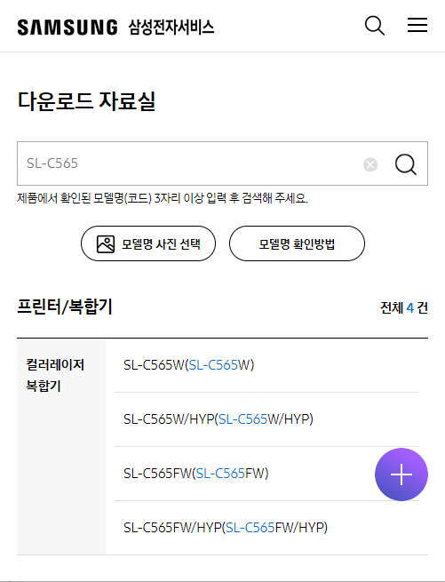 다운로드 자료실에서 현재 프린터/복합기 모델명을 입력해서 조회한다.