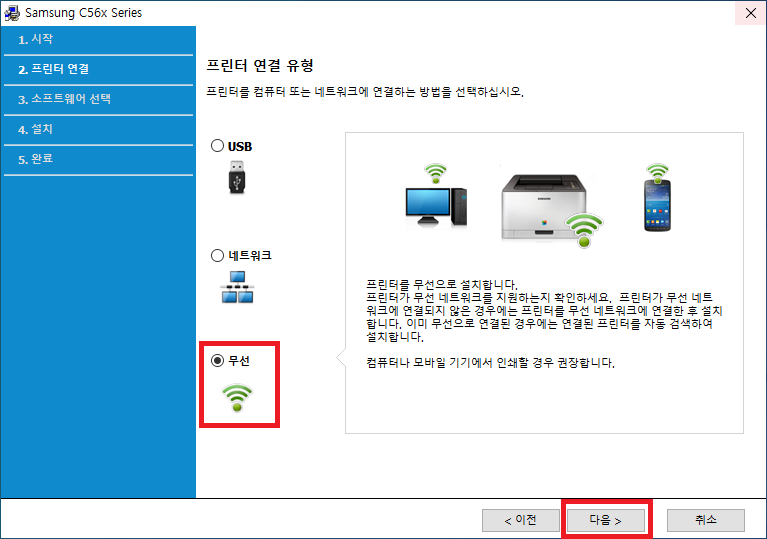 프린터를 무선연결을 진행하려면 아래와 같이 정리할 수 있다.