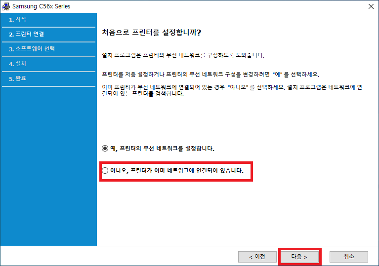 처음으로 프린터를 설정합니까? 에서는 "아니요, 프린터가 이미 네트워크에 연결되어 있습니다"를 선택한다.