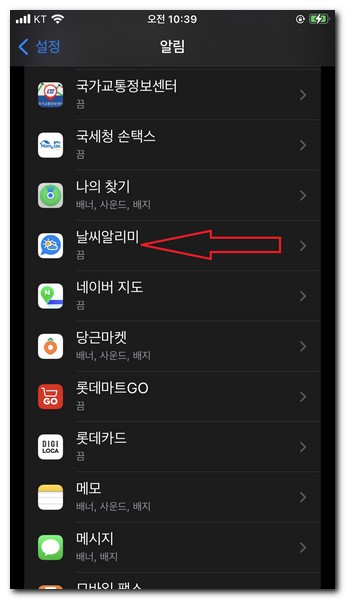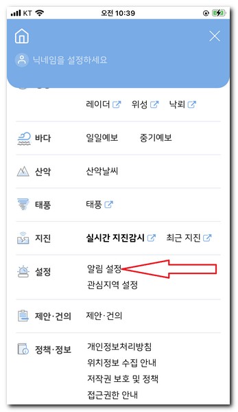 설정 -> 알림 -> 기상청 날씨 알리미 활성화