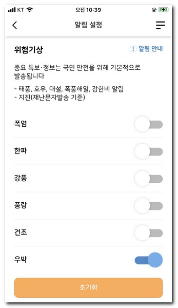 폭염, 한파, 강풍, 풍랑, 건조, 우박 등의 알림을 세부적으로 설정할 수 있는데, 활성화, 비활성화 메뉴를 통해서 허용, 중단을 선택할 수 있다.
