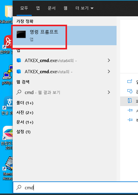 시작 버튼 클릭 -> 명령 프롬프트(cmd) 실행
