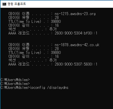 입력하게 되면 현재까지 내 컴퓨터에 쌓인 dns 캐쉬 정보를 확인할 수 있다. 필자의 경우 굉장히 많은 dns 캐쉬정보가 쌓였는데 인터넷을 많이 한다면 자연스럽게 많이 쌓이는 데이터들이다.
