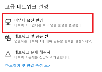 고급 네트워크 설정 메뉴가 보인다. 어댑터 옵션 변경 클릭