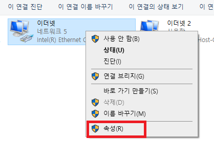현재 네트워크 드라이브 목록이 나타난다. 이더넷 네트워크 라고 표시된 부분을 마우스 오른쪽 버튼을 클릭해서 속성(R) 선택한다.