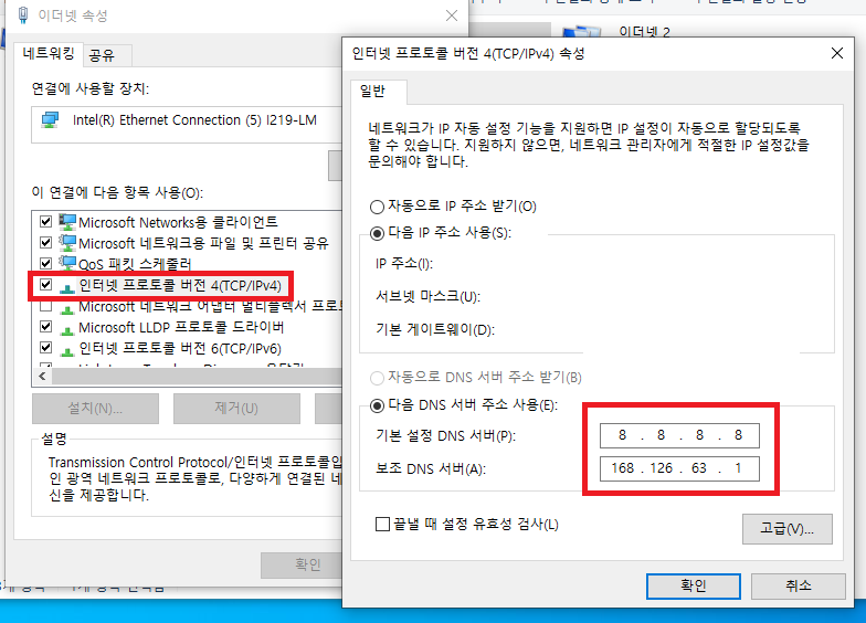 그리고 자동으로 DNS서버 주소 받기로 되어 있다면 다음 DNS서버 주소 사용(E)를 선택해서 구글DNS와 KT DNS 2개를 입력해준다.