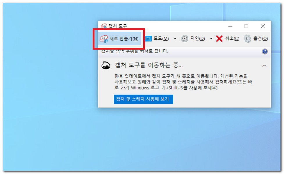 모드 선택을 통해서 자유형 캡처, 사각형 캡처, 창 캡처 3가지로 나뉘게 되는데 자유형 캡처는 연필 그리듯이 자유롭게 캡처영역을 선택해서 화면을 찍는 방식이고, 사각형은 방금 한 방식이다. 가장 기본적인 방식.