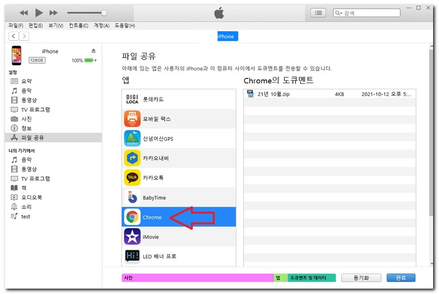 동기화가 완료되었다면 아이폰을 다시 확인한다.(동기화 중이라고 계속 표시되지만 실제로 아이폰으로 옮겨진 상태일 수도 있다.)