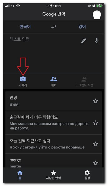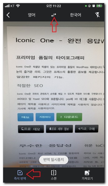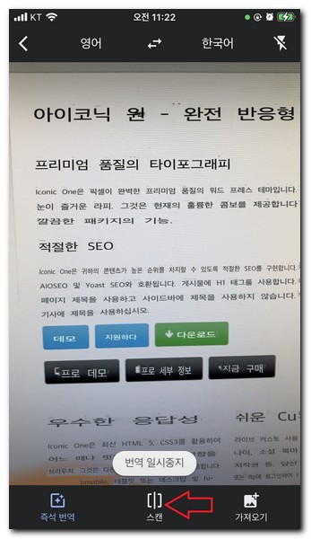 책에 있는 외국어 문장이나 누군가의 대화 내용등을 번역해서 복사하고 싶을때에는 "스캔" 옵션을 선택한다.