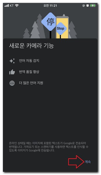 새로운 카메라 기능을 사용하려면 "계속" 버튼을 선택한다.