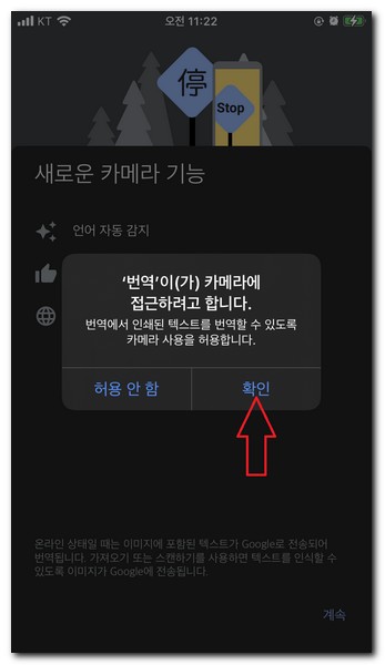 구글 번역앱이 카메라에 접근 할 수 있도록 "허용"한다.
