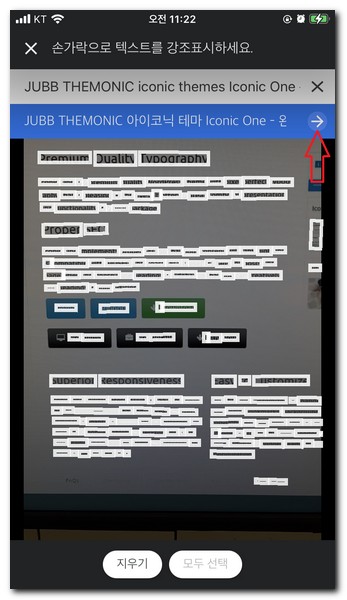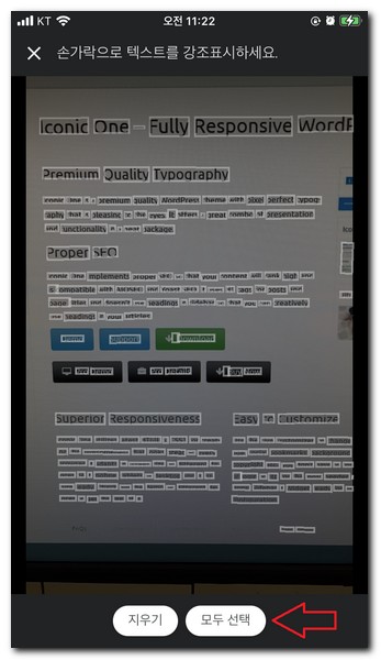 화면에 보이는 글자가 모두 선택되기 위해서는 "모두 선택"을 선택한다. 손가락으로 텍스트를 강조표시할 수 있다.
