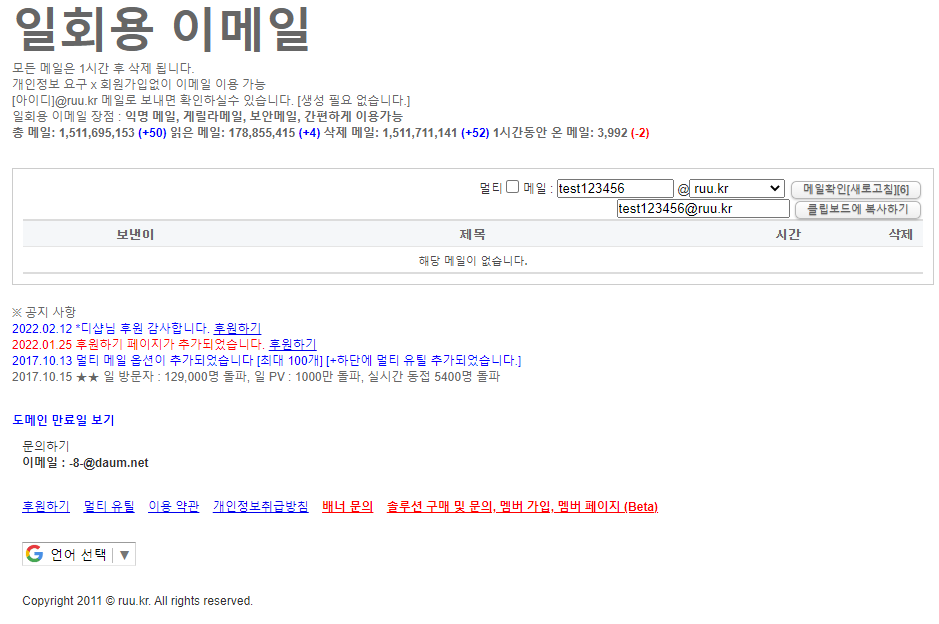 ruu라는 일회용 이메일 사이트다. 모든 메일은 1시간 후 자동 삭제 된다.