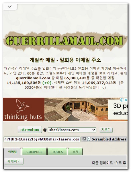 guerrillamail 사이트는 게릴라 메일 일회용 이메일 주소를 제공해주는 사이트다. 임시 이메일 주소를 발급 받고 회원가입 없이 60분 동안 사용가능하다.