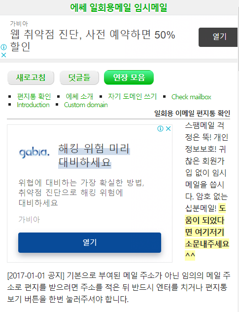 도메인 종류도 많고 사용할 수 있는 이메일 주소가 많다는게 장점이다. 실시간으로 받은 편지함에 메일을 받을 수 있다.