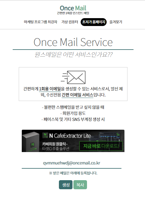 스팸메일 걱정 없고 개인정보보호도 되면서 귀찮은 회원가입 없이 임시 이메일 주소를 사용할 수 있다.
