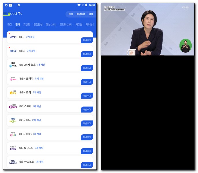 필자가 KBS1 채널을 터치해서 직접 시청을 해본 결과 화면 영상 끊김 없이 매우 만족스럽게 영상시청이 가능하다는것을 확인할 수 있었다.