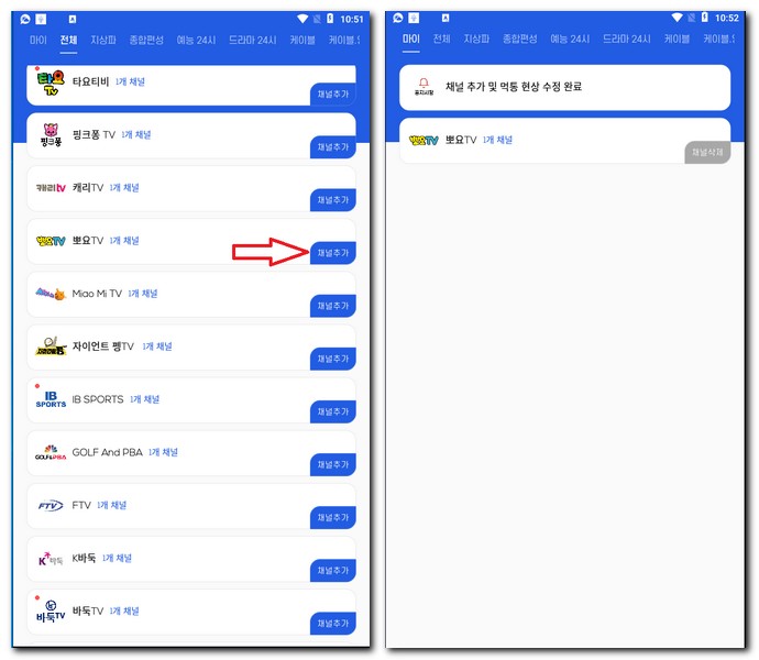 채널추가를 하게 되면 즐겨찾기 추가하듯이 마이 페이지에 채널추가가 되어있는것을 확인할 수 있었다.