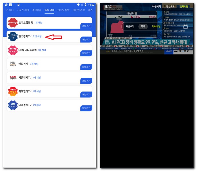 한국경제TV, MTN 머니투데이, 매일경제, 서울경제TV, 이데일TV, 내외경제TV 중에 하나 선택해서 시청하면 된다. 필자는 한국경제TV를 선택해서 시청하게 되었다.