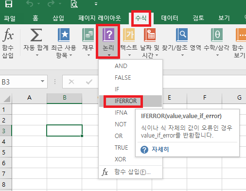 엑셀을 실행한다. 필자는 엑셀 2016버전이다. 상단 메뉴에 수식 -> 논리 -> IFERROR 함수를 클릭한다.